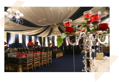 All kinds of required tentage , furniture , carpets , table linens spreads , gazebo’s , air conditioned tents , hangers & “pandals”